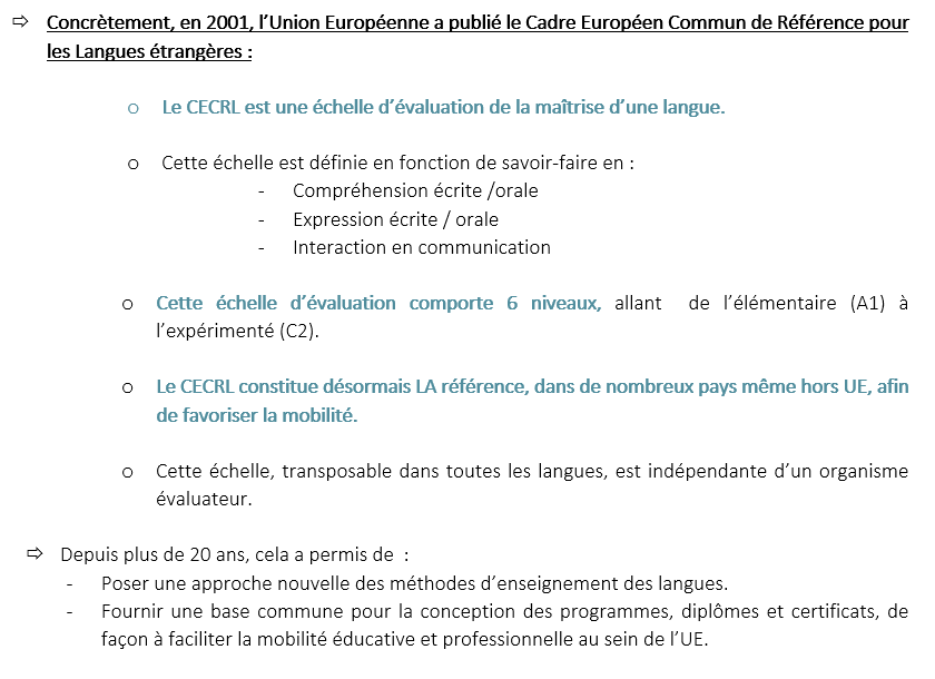 Sous cet acronyme « CECRL » (pour Cadre Européen Commun de Référence pour les Langues étrangères) se cache une réalité qui nous concerne tous :